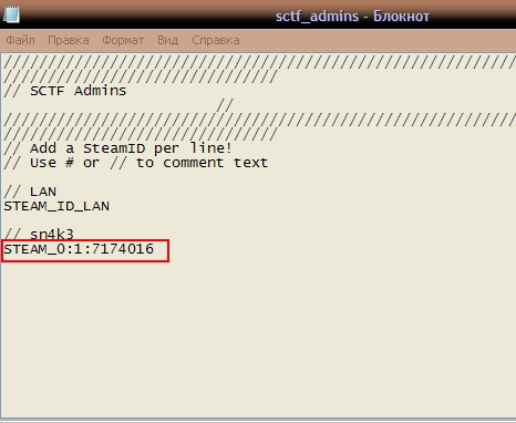 Но прежде чем запустить сервер, сделаем себя админом данного мода. Для этого идем в папку на вашем сервере ....\Server\SHL2\cstrike\addons\eventscripts\sctf\cfg и открываем блокнотом текстовый файл sctf_admins.txt, и вписываем свой STEAM_ID как показано на скриншоте ниже: